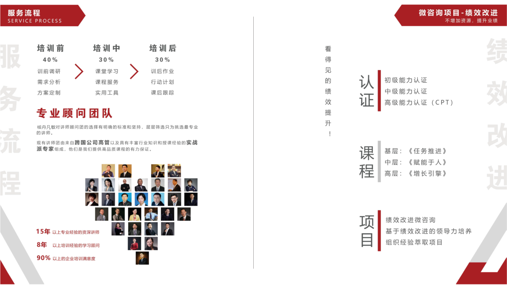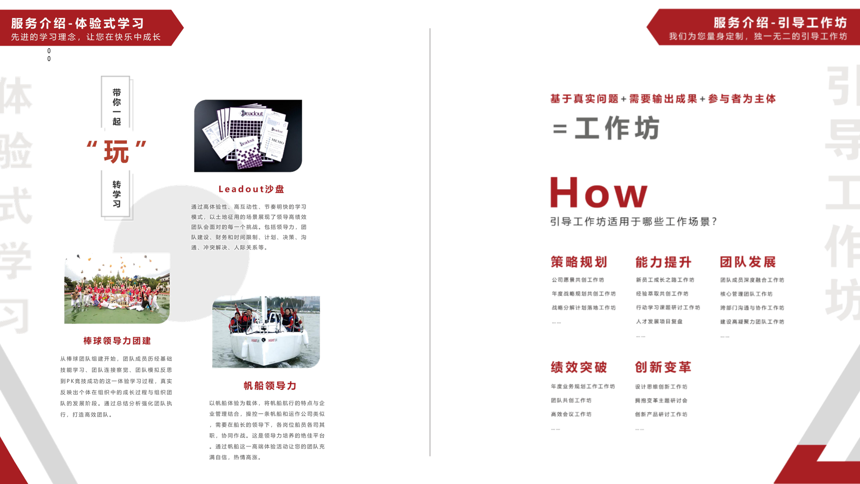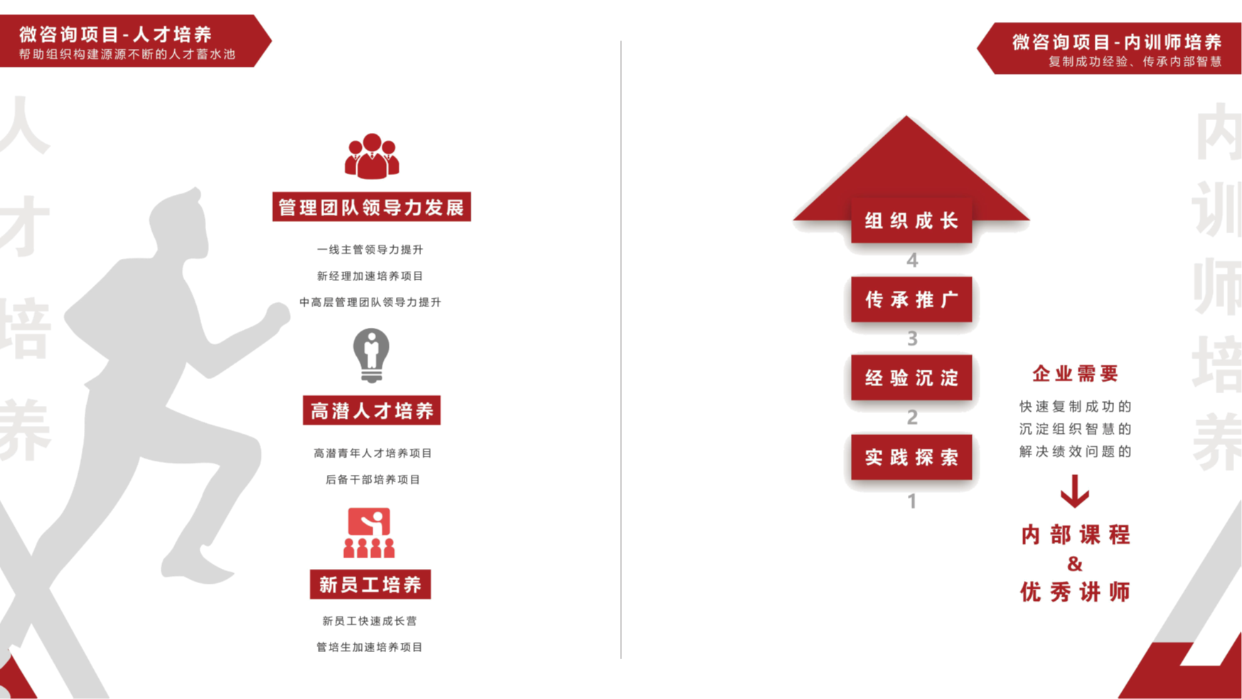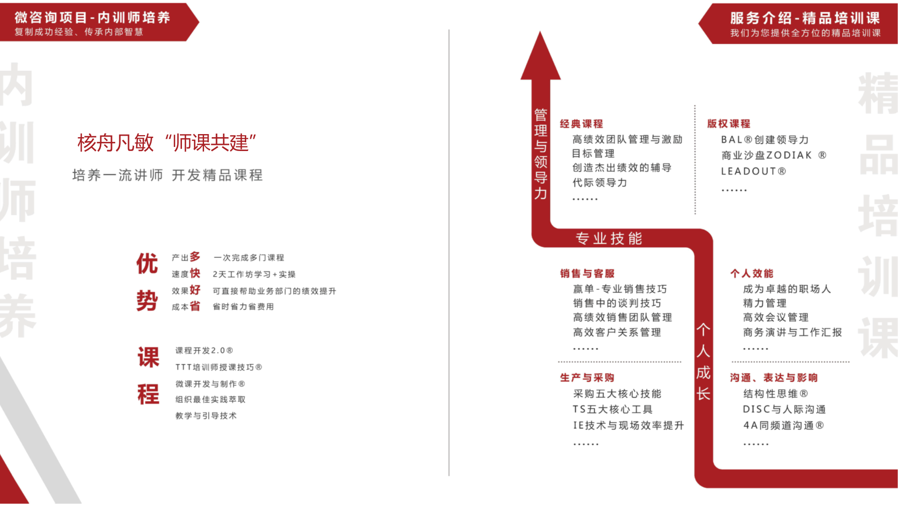 精品項目定制、精品課程學習、版權課程引進與培訓、績效改進微咨詢、結構化思考、創新模型課堂、主題工作坊、沙盤定制課堂、項目考察等服務。