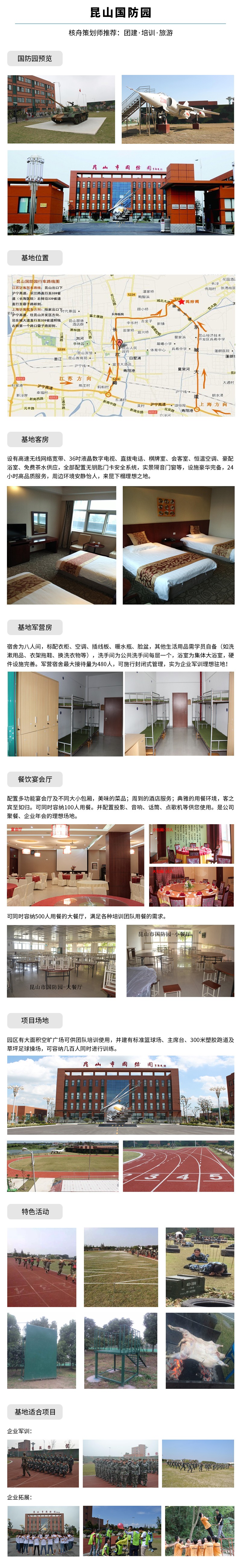 國防園由昆山市政府和昆山武裝部共同投建,基地配套設施完善,有準四星配置的酒店服務;有功能齊全的多媒體會議室;有豐富齊全的拓展設施;有休閑娛樂的軍事旅游;有安全先進的輕武器實彈射擊靶場...曾多次被上級評為先進訓練單位,是理想的技能培訓場所。現已成為江蘇省目前設施配套,功能、檔次最高的國防教育訓練及拓展訓練基地之一。基地可同時接待千余人的培訓、住宿與用餐服務。我們熱烈歡迎四方來賓蒞臨昆山國防園參觀指導,考察體驗及開展各類團隊活動。您的需要,是我們共同努力的目標,您得到的將遠遠超出您的想象。