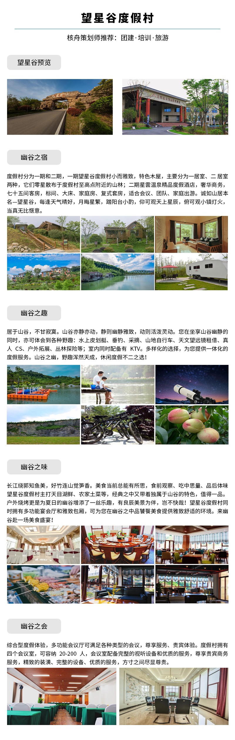 核舟溧陽團建基地—望星谷度假村,鄰近國家5A級旅游度假區南山竹海與御水溫泉,峰巒疊嶂,碧水 如鏡,青山浮水,倒影翩翩,幽谷之景猶如一副天然畫卷,讓人沉醉其中。度假村占地七百余畝,目前已建成一期和二期,綠色植被面積占比近百分之八十,自然之景與人工點綴相映成趣、相得益彰,最大程度的保留了山谷的原生態。 度假村集客房、餐飲、會議、休閑娛樂于一體,致力于打造全方位、一體化(天然、舒適、回歸自我本真)的休閑度假模式, 足不出戶即可享受幽谷之趣。