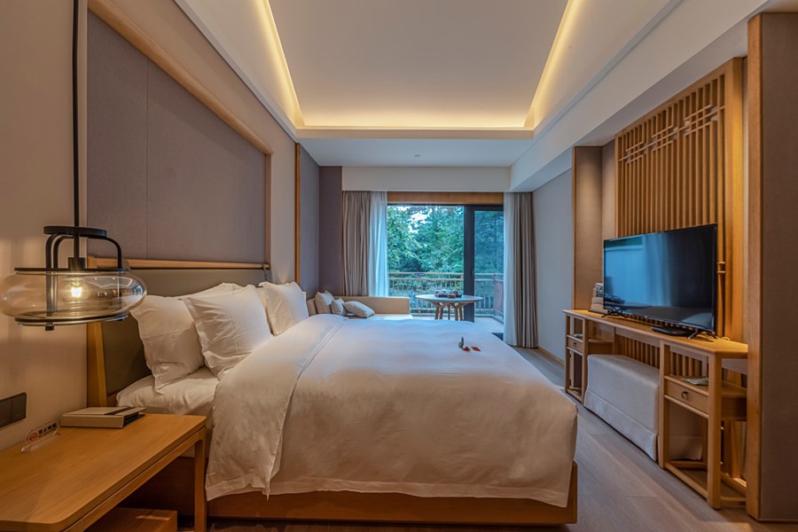 每一個房間都有獨一無二的觀山角度,依傍山峰,推窗即景。山谷的自然氤氳,與徽派建筑的厚重內(nèi)向形成對比,遠(yuǎn)眺著群山,用貼切的感官感受著山色之美。