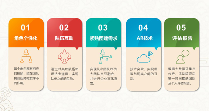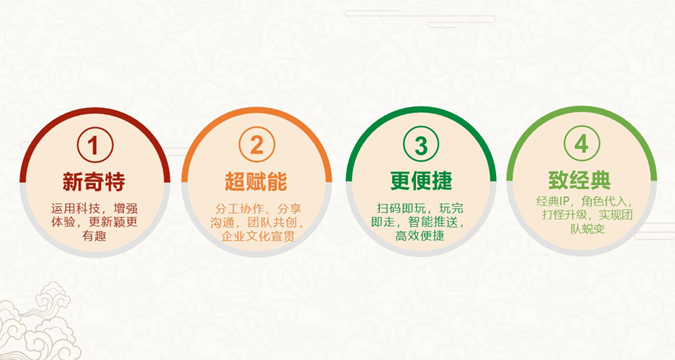 西游記是我們耳熟能詳的經典IP,該產品把西游元素引入團建活動中,借助先進的互聯網技術,通過線上操作+線下體驗融入AR虛擬+現實技術,還原西游取經關卡挑戰,給團隊帶來一場沉浸式的體驗,激發團隊活力,提升團隊效能。